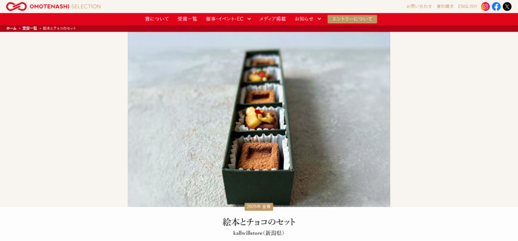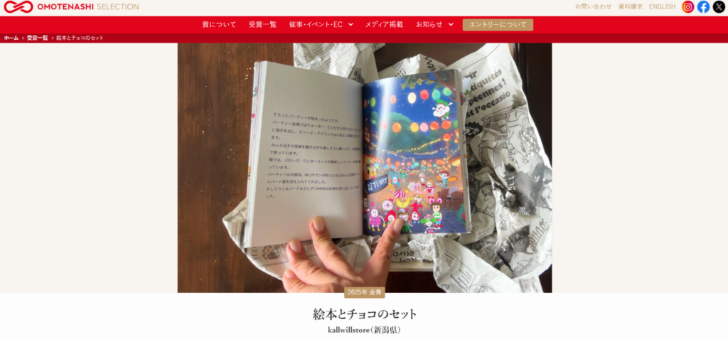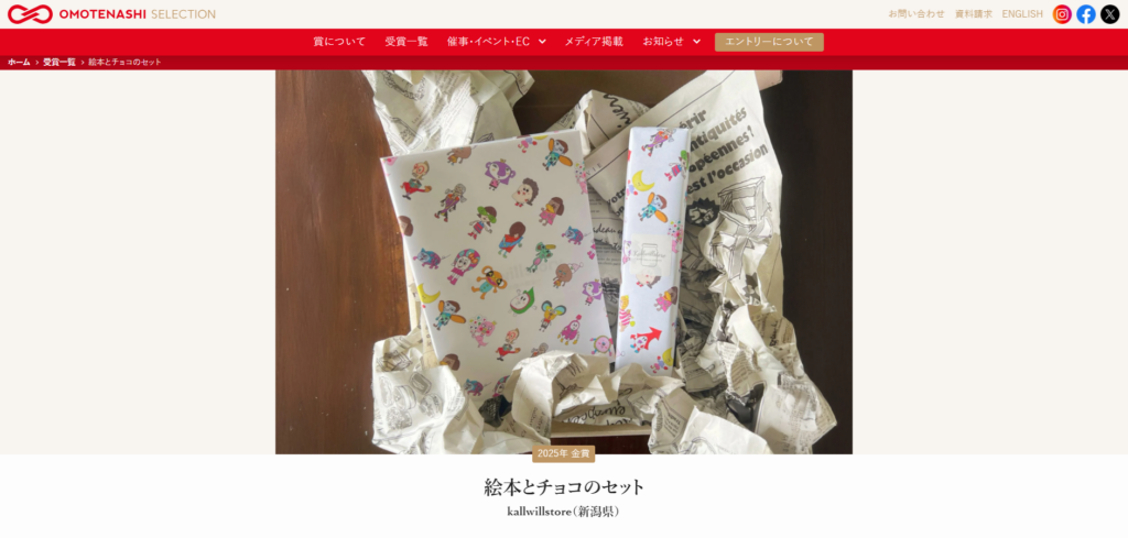 本件は、kallwillstore様が手掛ける「(新潟県)絵本とチョコのセット」が、外国人選定員による評価を含む厳正な審査を経て、その品質と、日本独自の精神である「おもてなし」の心に満ちた魅力が認められた結果となります。